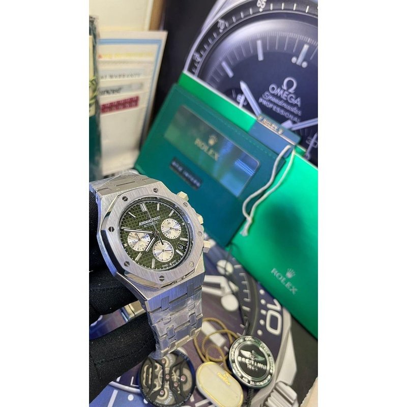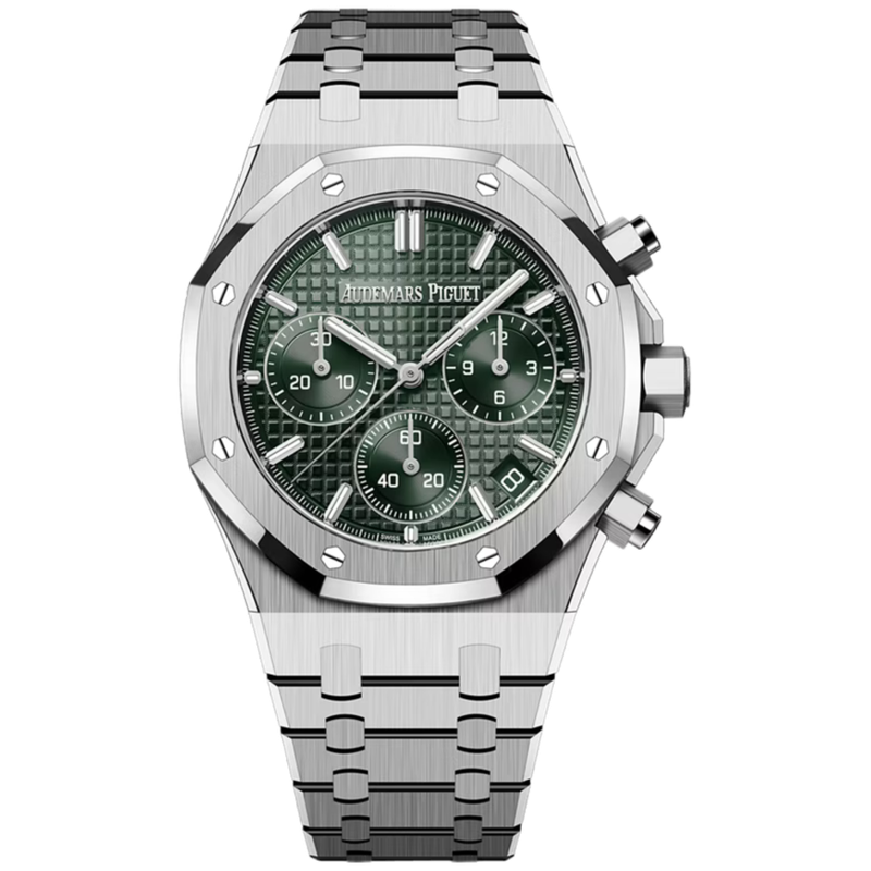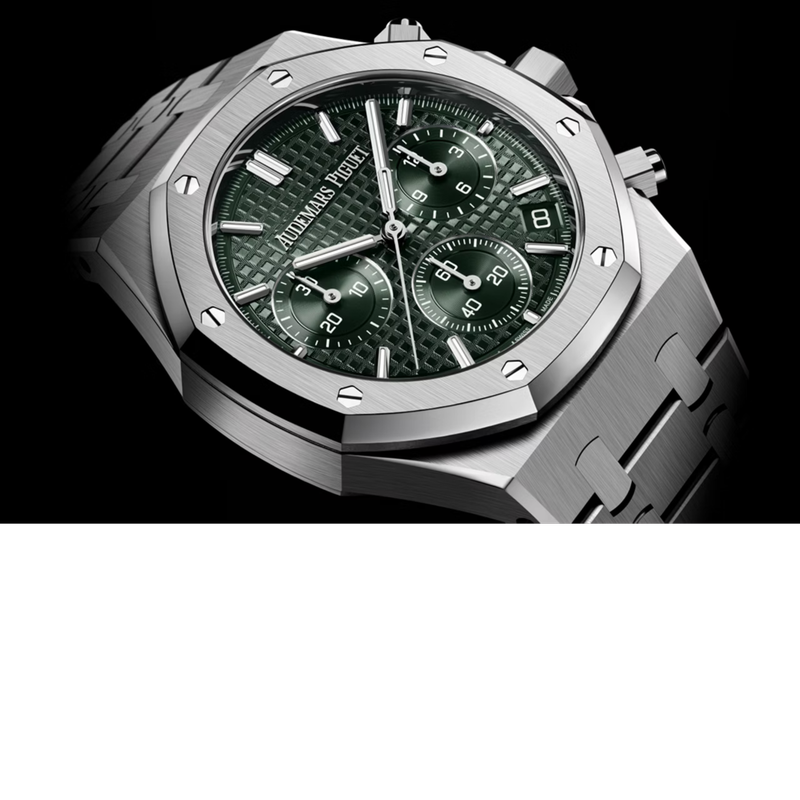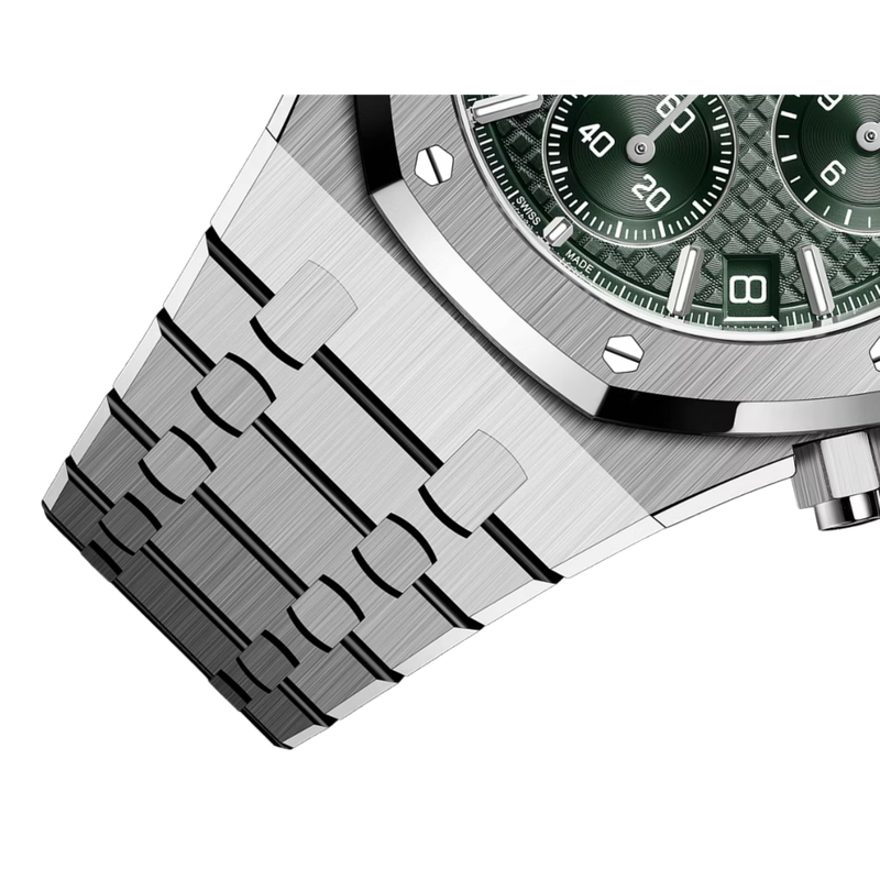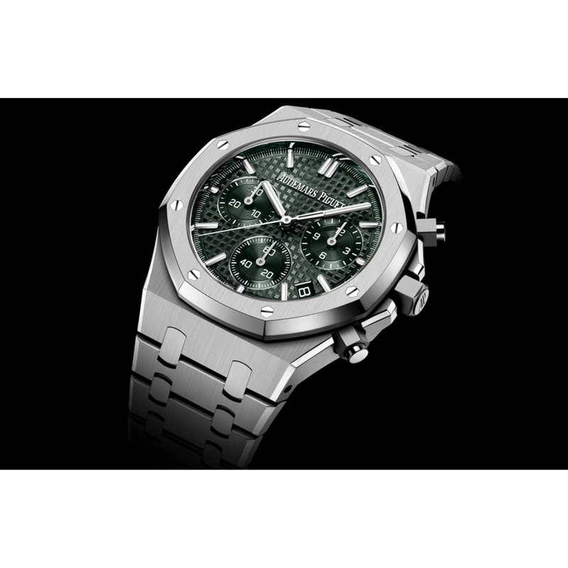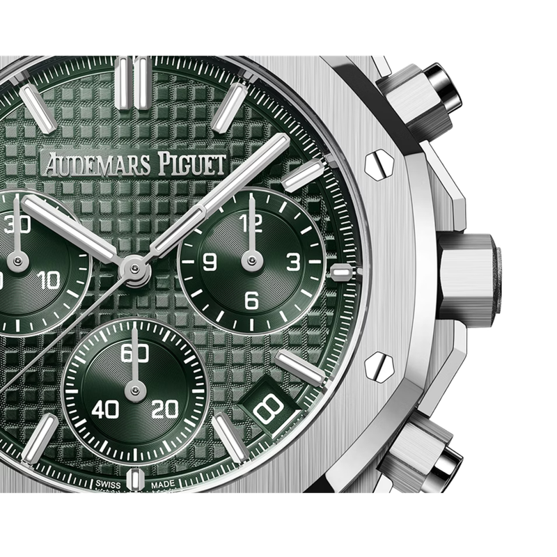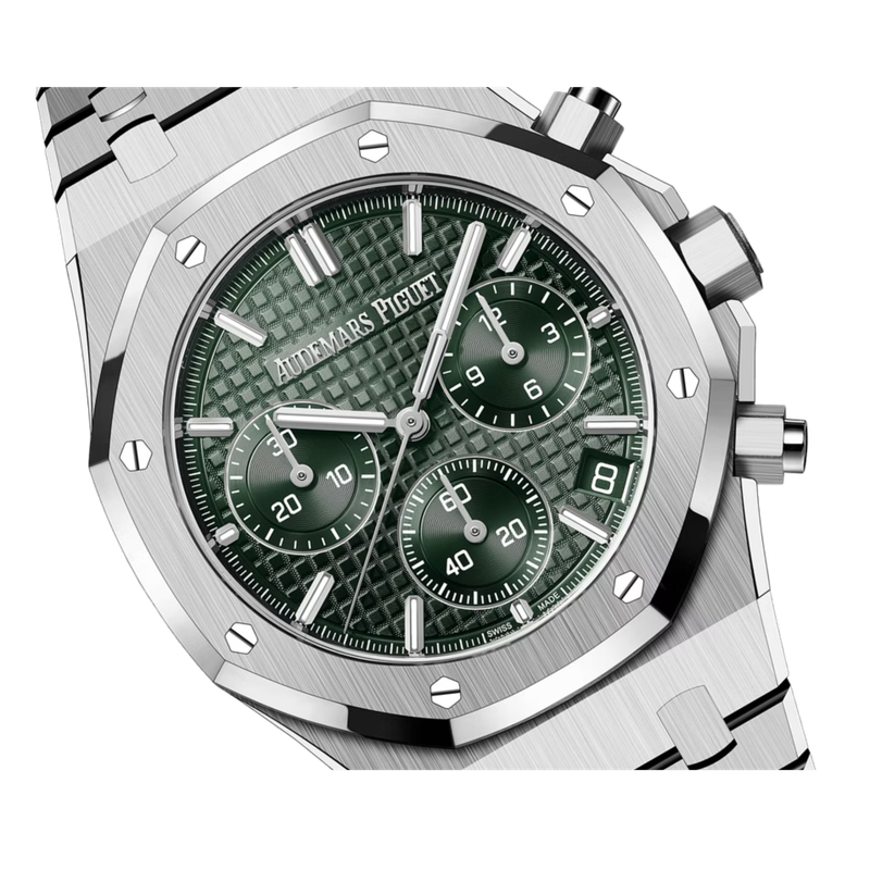 Cadran vert kaki à motif Grande Tapisserie, trois sous-compteurs verts, aiguilles et index luminescents. Discret guichet date entre 4 et 5h.