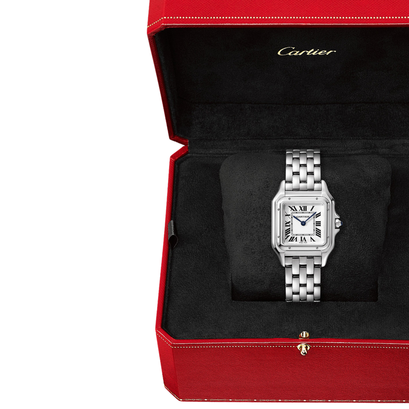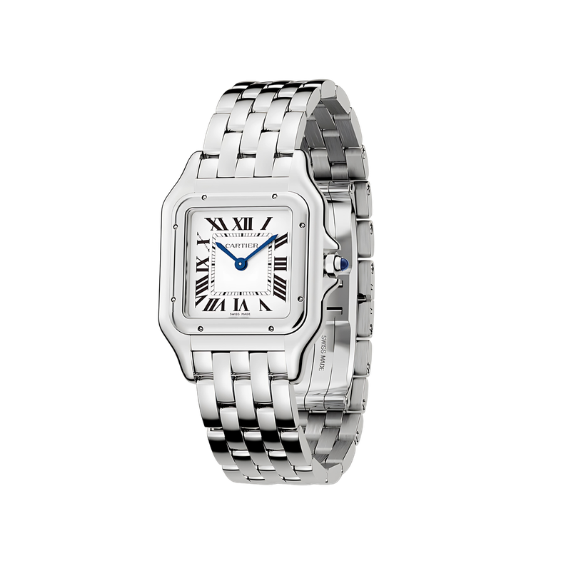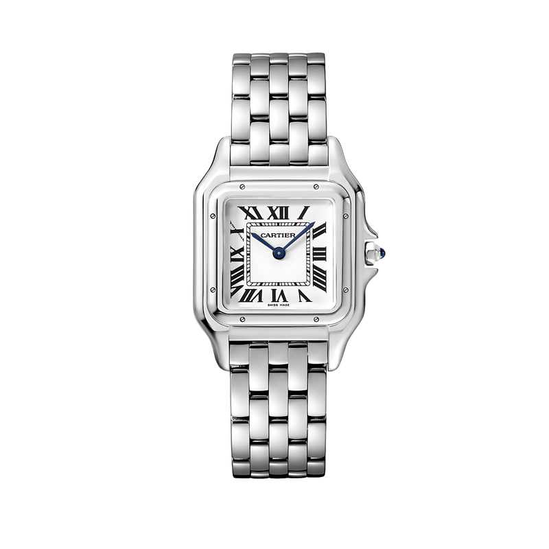 Le boîtier de la montre, aux lignes carrées et mesurant 27 mm, est conçu en acier inoxydable poli. Cette silhouette raffinée dégage un charme discret et féminin, parfait pour celles recherchant une élégance simple mais impactante. La couronne cannelée est décorée d’un cabochon bleu, ajoutant une touche de distinction facilement reconnaissable.