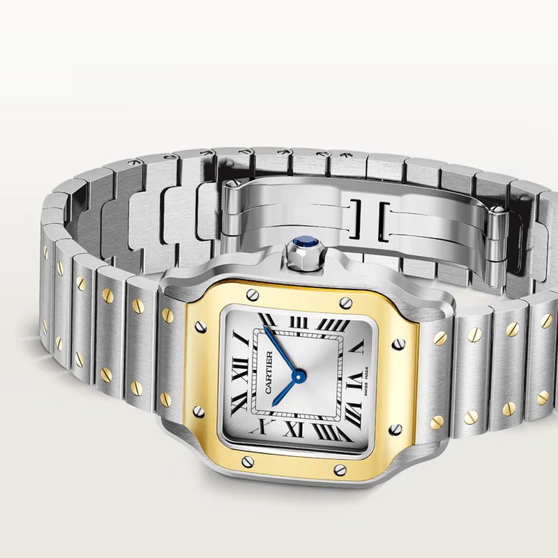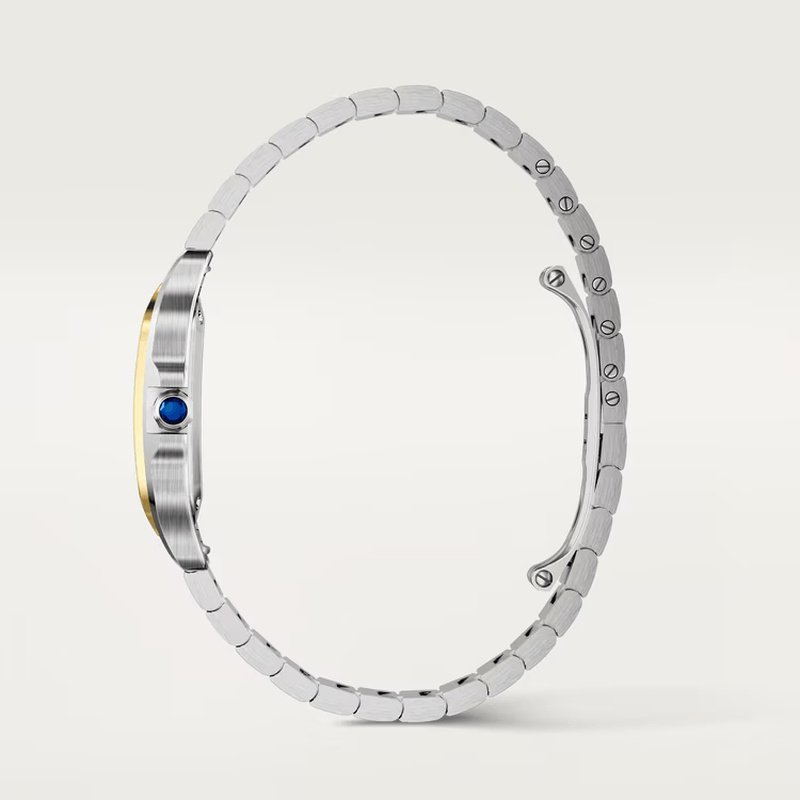 Bracelet en acier inoxydable brossé avec maillons dorés à vis apparentes, soulignant l’allure bicolore emblématique de la collection Santos.