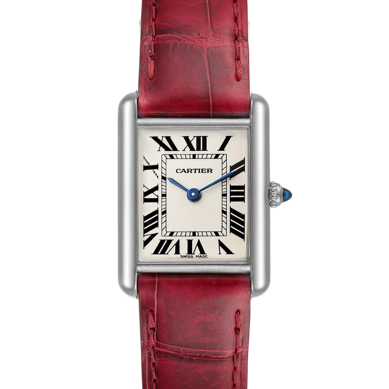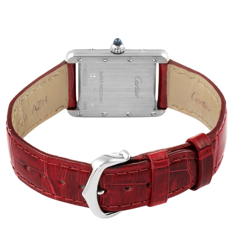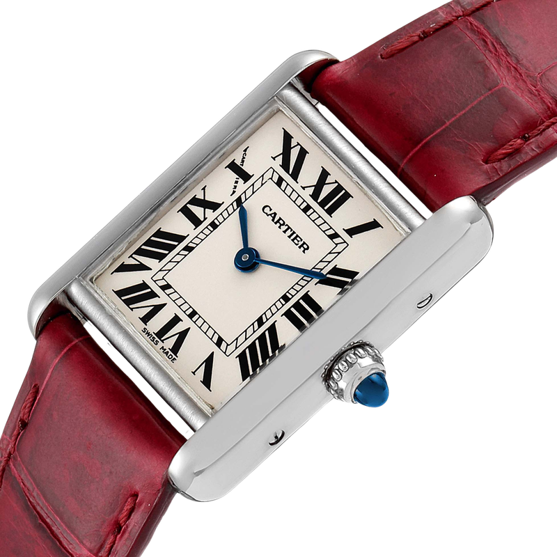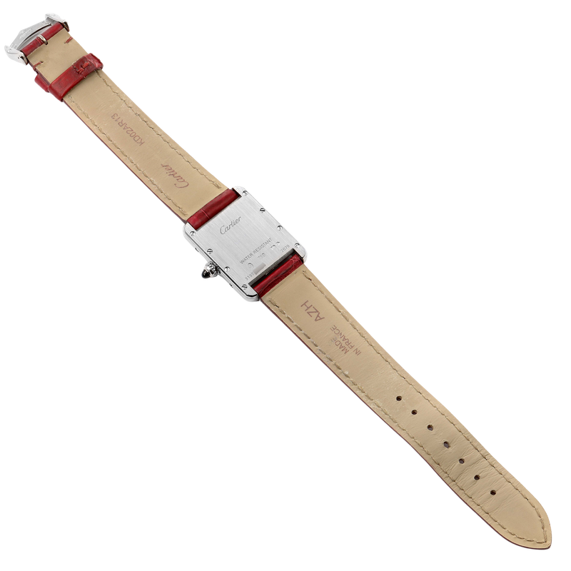 Le boîtier de la montre est confectionné en acier inoxydable poli, présentant une forme rectangulaire emblématique qui conjugue raffinement et modernité. Sa silhouette soignée est idéale pour les amateurs de design épuré. Doté d’une couronne cannelée surmontée d’un cabochon décoratif bleu, le boîtier ajoute une note de distinction subtile à l’ensemble, tout en garantissant robustesse et style.