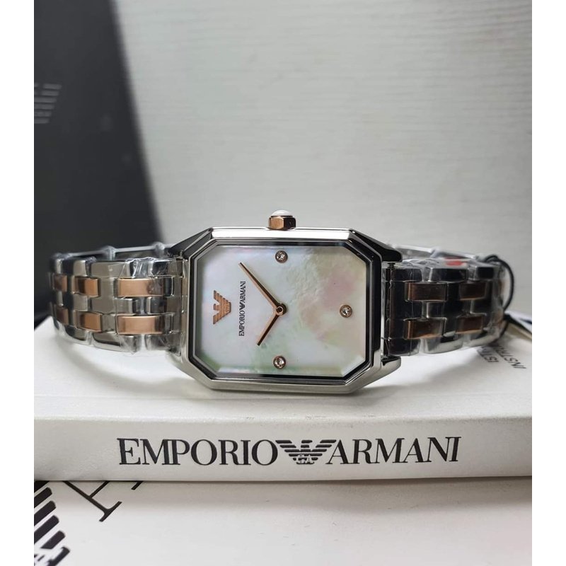 Le cadran de cette montre arbore un design minimaliste avec un fond clair en nacre. Les index en cristal ajoutent une touche d’élégance et de brillance, tandis que la signature discrète d’Emporio Armani est placée à midi, offrant une allure raffinée et chic.