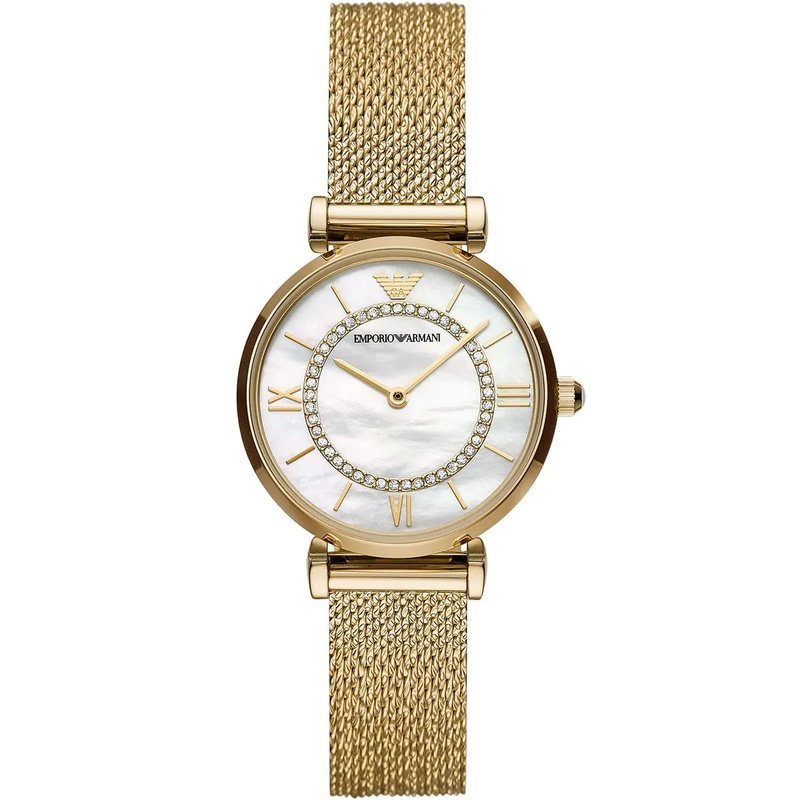 Le cadran de cette montre se distingue par sa nacre blanche, apportant une élégance subtile et raffinée. Les index romains situés à 3, 6 et 9 heures ajoutent une touche classique, tandis que des cristaux embellissent son allure. Le logo Emporio Armani à 12 heures finalise le design avec une marque de sophistication. Les aiguilles, dorées, sont conçues pour indiquer précisément les heures et les minutes.
