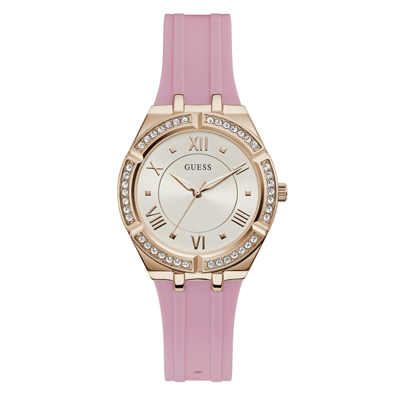 Boîtier rond en acier inoxydable poli, couleur or rose, avec lunette ornée de cristaux. Diamètre de 36 mm pour une présence élégante au poignet. Épaisseur : 9,35 mm.