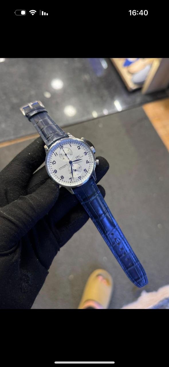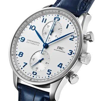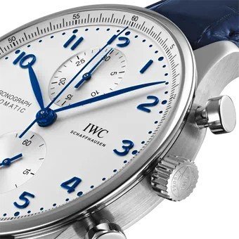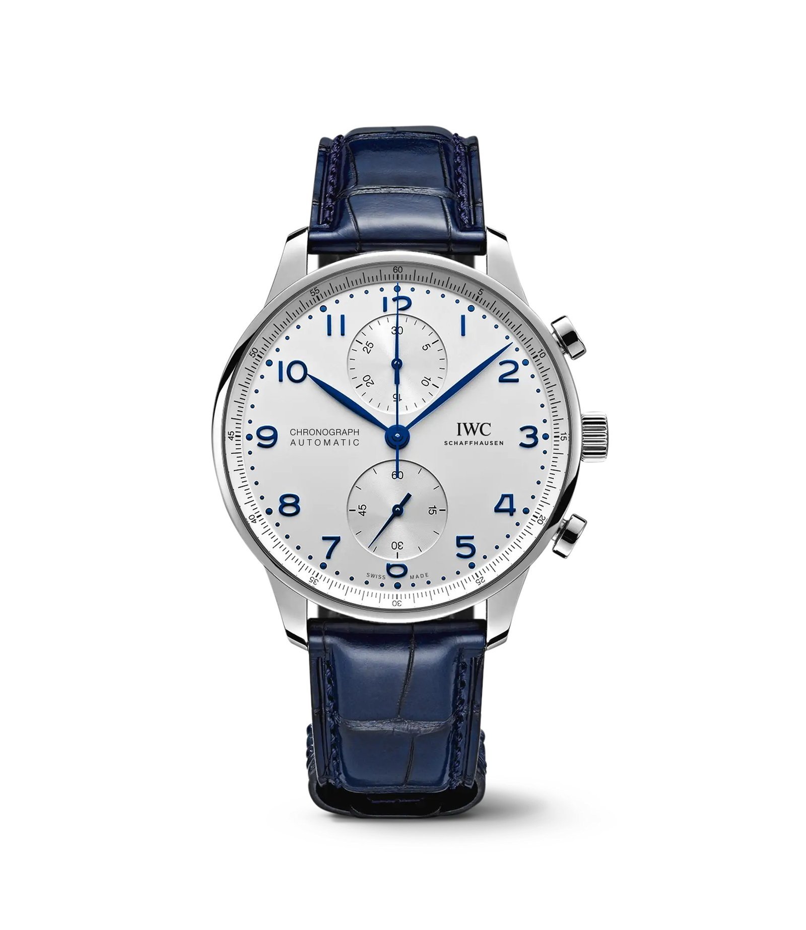 Fond clair (écru/argent) à finition satinée, chiffres arabes appliqués bleus, deux totalisateurs symétriques (compteur 30 min à 12 h, petite seconde à 6 h), minuterie fine périphérique et aiguilles bleuies élégantes.