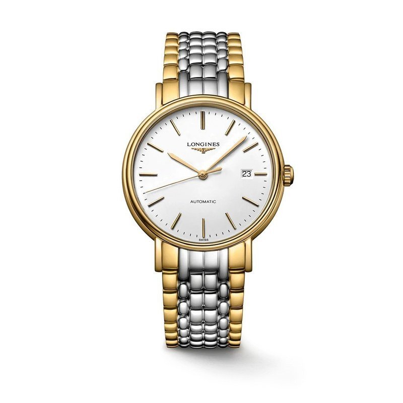 Cadran blanc épuré avec index dorés et aiguilles assorties, affichage date à 3h. Lisibilité parfaite et allure raffinée.