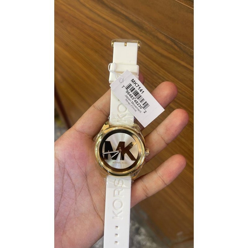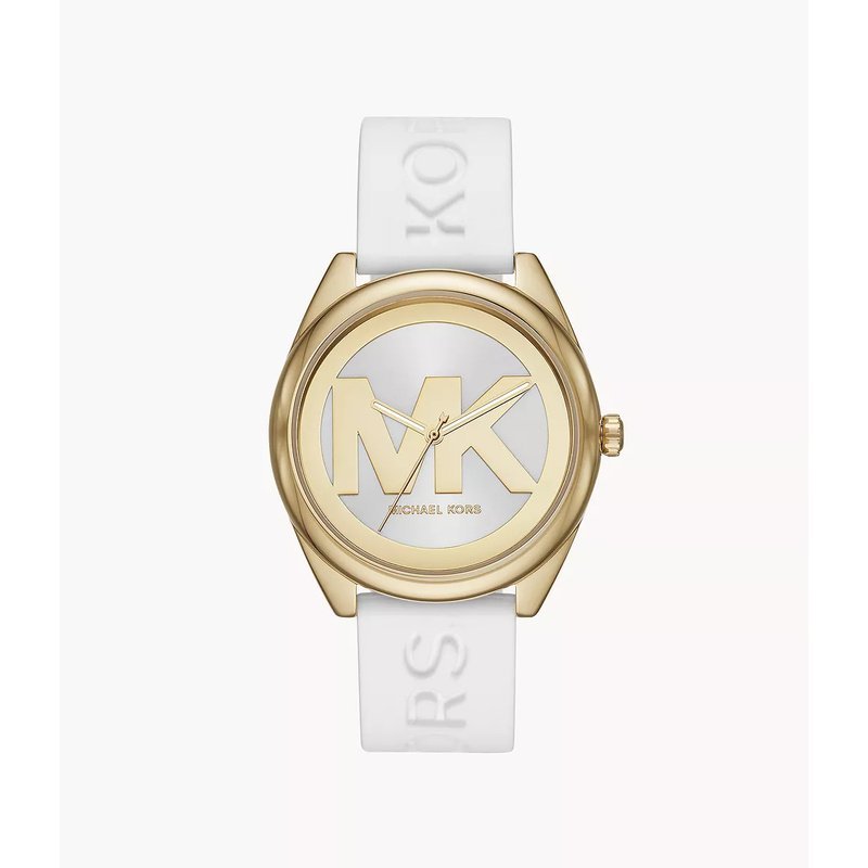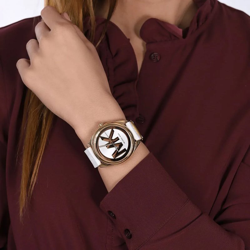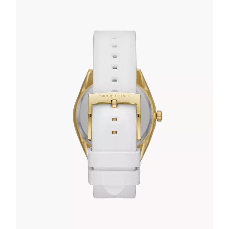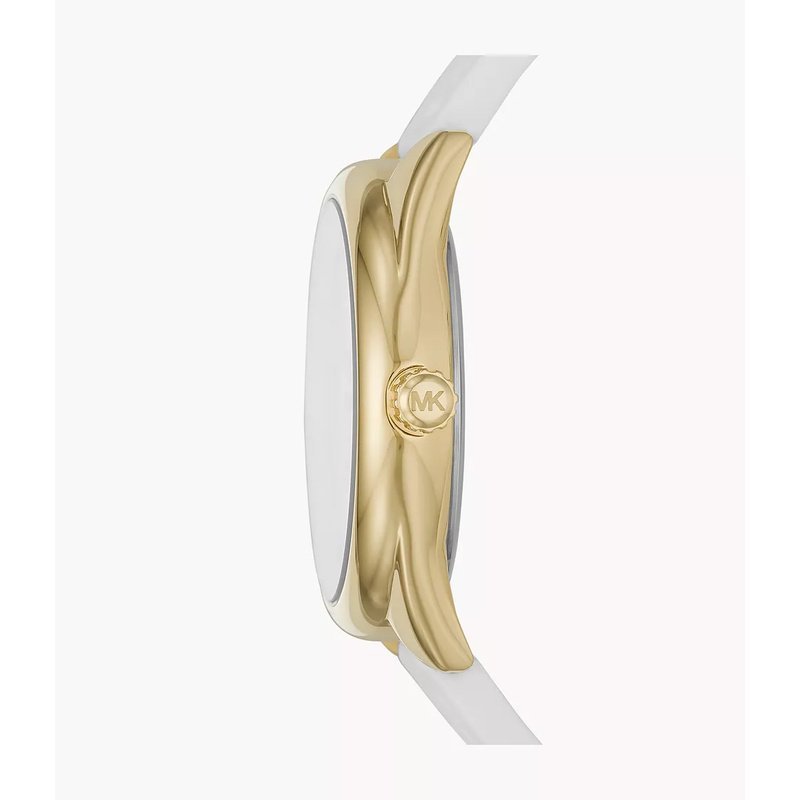 Cadran blanc mat orné d’un grand logo MK en ton doré. Aiguilles assorties pour une lecture fluide.