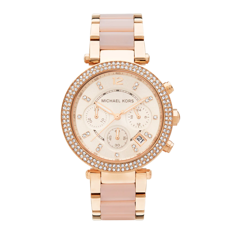 Le boîtier de la montre se présente en un format rond de 39 mm, confectionné en métal doré rose, ce qui lui confère une allure chic et contemporaine. Il est accentué par un double rang de cristaux scintillants, ajoutant une touche de glamour qui s’harmonise parfaitement avec le cadran. Le verre minéral est conçu pour résister aux petites rayures du quotidien. Avec une épaisseur de 12 mm, le boîtier offre une présence remarquée au poignet sans être excessif.