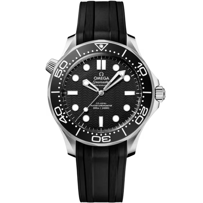 Montre de plongée sportive en acier inoxydable, Ø 42 mm, modèle de la collection « Diver 300 M », cadran noir gravé motif vagues, lunette noire unidirectionnelle, mouvement automatique certifié Master Chronometer.