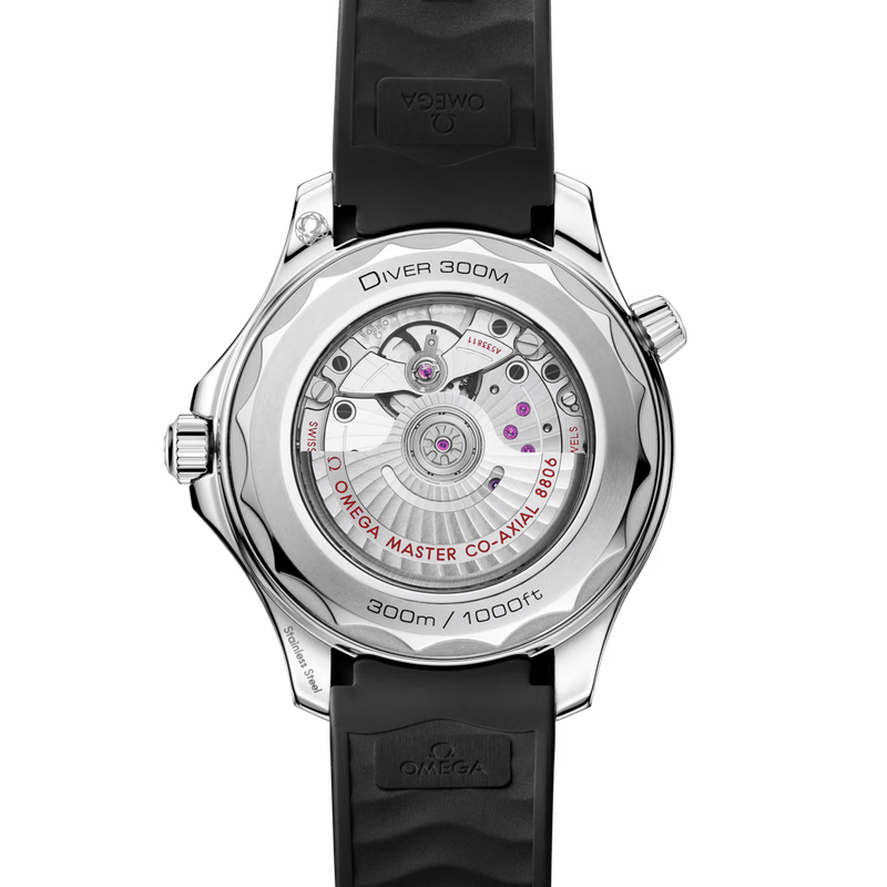 Acier inoxydable, diamètre 42 mm, lunette rotative unidirectionnelle avec insert aluminium anodisé noir et échelle plongée en Super-LumiNova blanche. Verre saphir bombé traité antireflet à l’intérieur, fond transparent. Étanchéité à 300 m (30 bars).