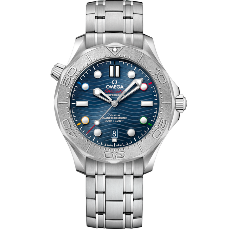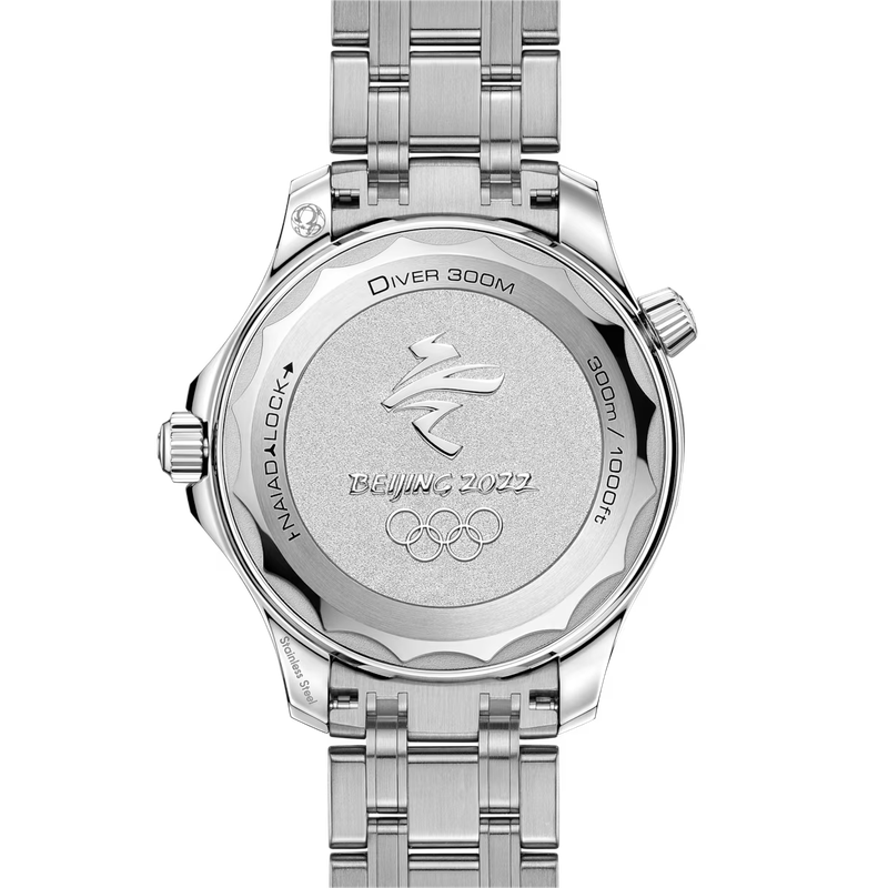 Acier inoxydable, diamètre 42 mm, verre saphir anti-reflet double face, lunette plongée en acier avec insert bleui, couronne vissée, étanchéité 30 bars (300 m).