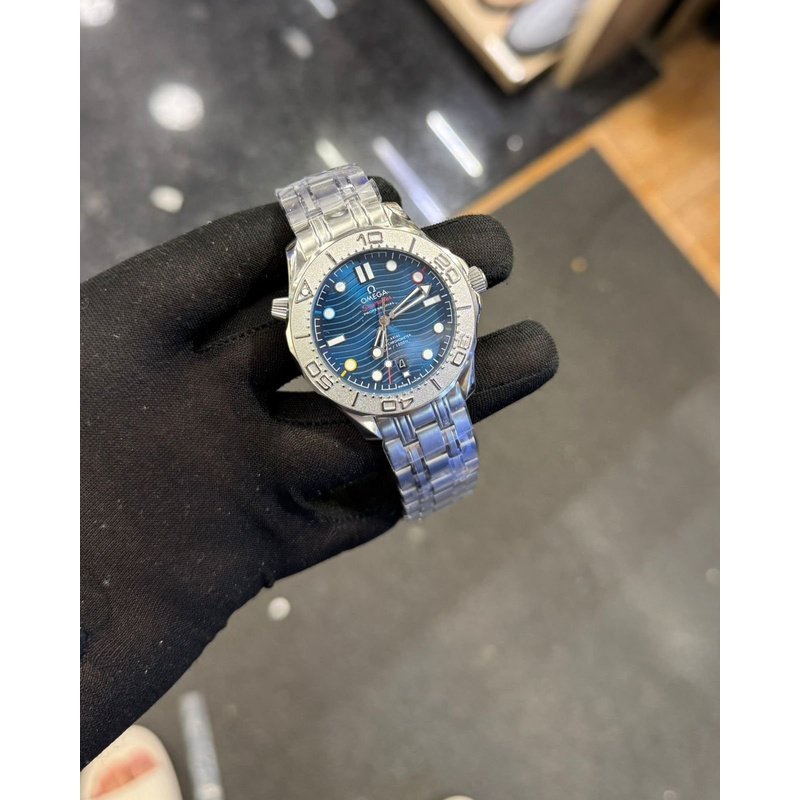 Fond bleu décor « vagues » gravé au laser, index appliqués rhodiés remplis de Super-LumiNova, fenêtre date à 6 h, aiguilles « squelette » également remplis de Super-LumiNova.