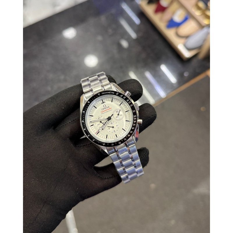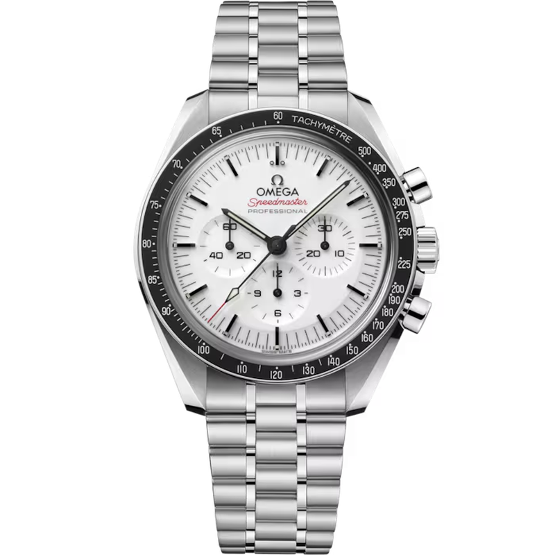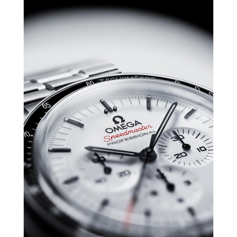 Cadran blanc laqué à plusieurs niveaux (« step dial ») avec logo appliqué OMEGA et index appliqués, aiguilles de style Moonwatch, sous-cadrans : petite seconde à 9 h, compteur 30 minutes à 3 h, compteur 12 heures à 6 h. Lunette noire anodisée avec échelle tachymétrique « dot over 90 ».