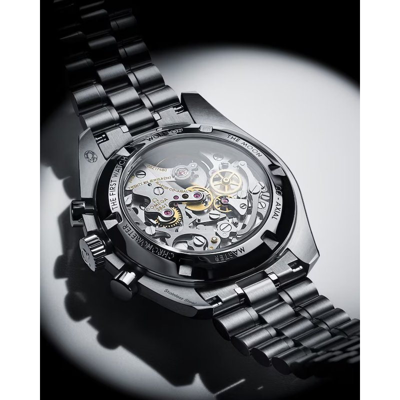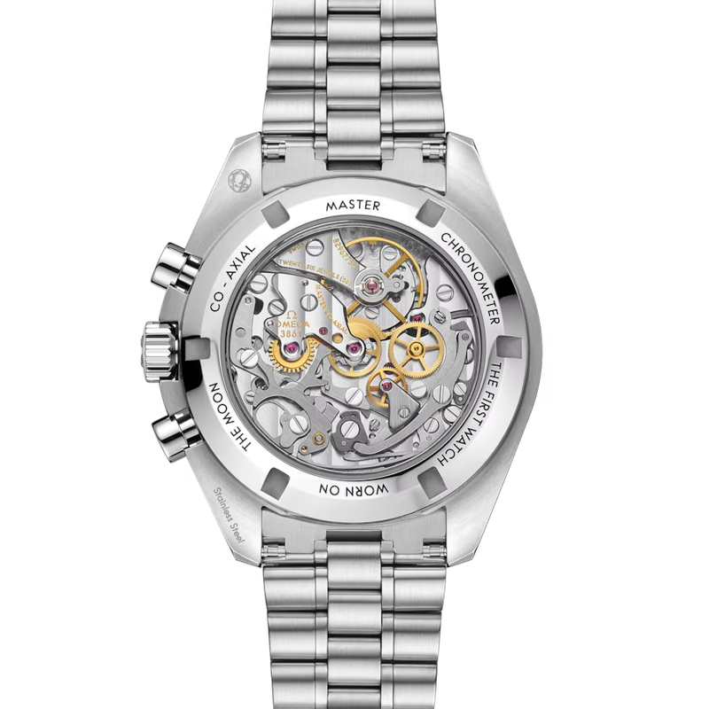 Calibre OMEGA 3861, remontage manuel, certification Master Chronometer (METAS), chronographe roue à colonnes, petite seconde, 30 min et 12 h totalisateurs, antimagnetique (> 15 000 gauss), réserve de marche d’environ 50 heures.
