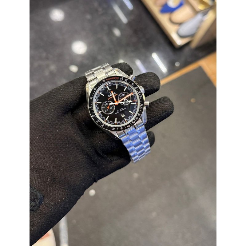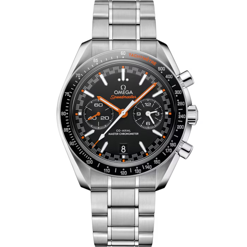 Cadran noir mat, piste des minutes « racing style » entourant le cadran, index flèche en or blanc 18 K remplis de Super-LumiNova blanche. Aiguilles heures/minutes blanches et orangées (pour la ponctuation sportive), sous-cadrans chronographe (60 min/12h) et petite seconde, date à 6 h discrète. Lunette extérieure céramique noire, échelle tachymétrique avec inscriptions orange et chiffres Liquidmetal™