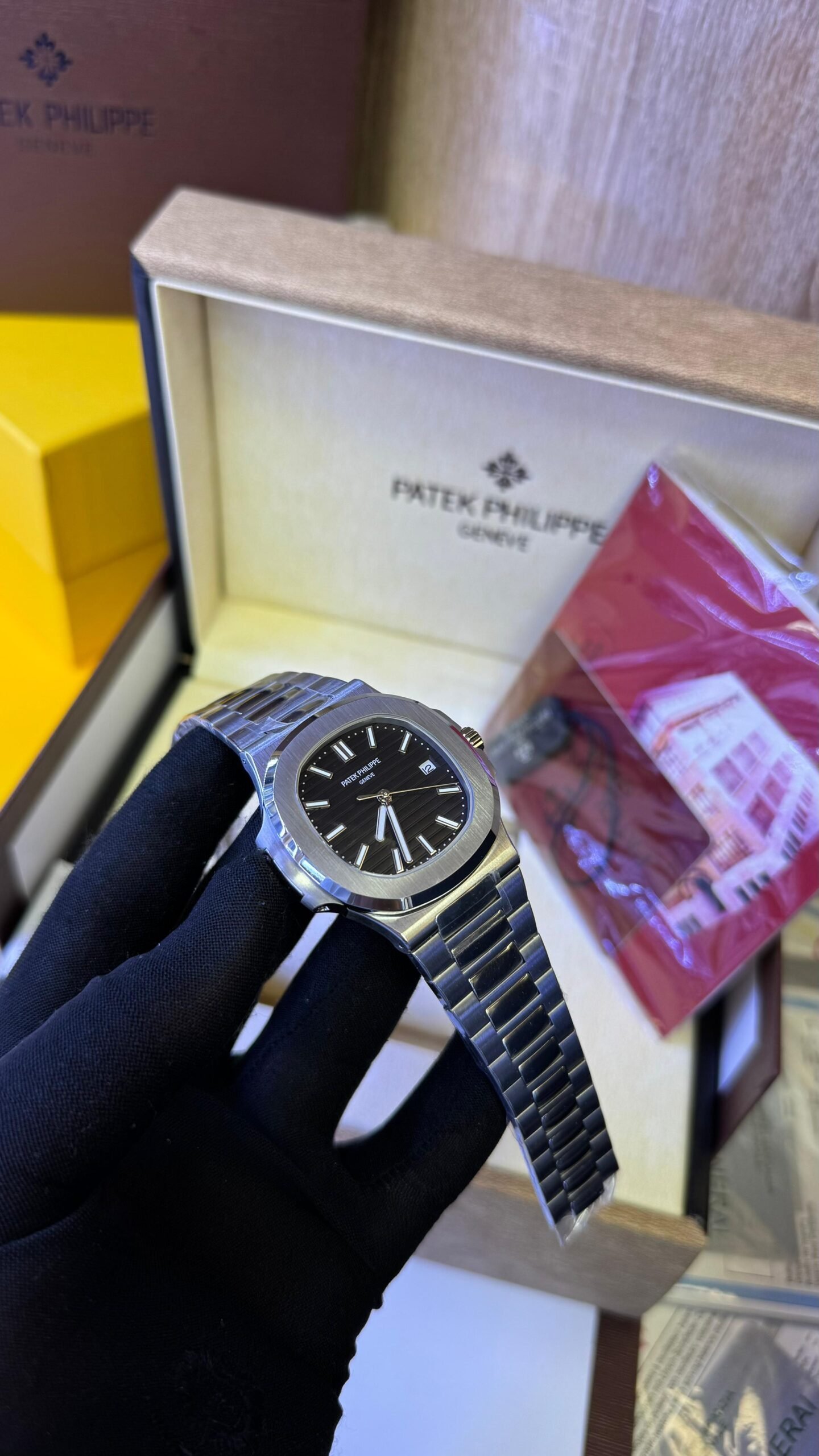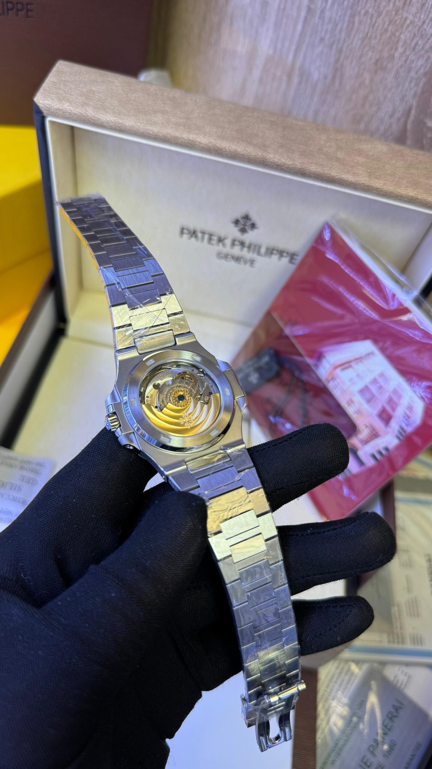 Le boîtier en or gris affiche un diamètre équilibré de 41 mm pour une épaisseur de seulement 8,2 mm. Il est étanche jusqu’à 30 mètres, muni d’une couronne vissée et d’un fond en verre saphir transparent, révélant le mouvement avec raffinement.