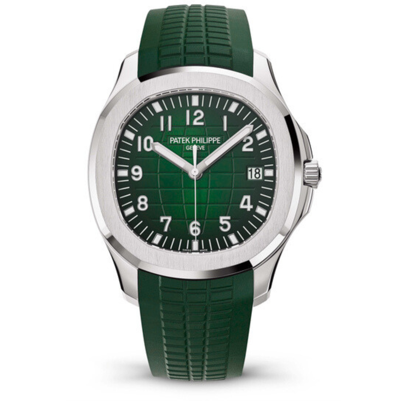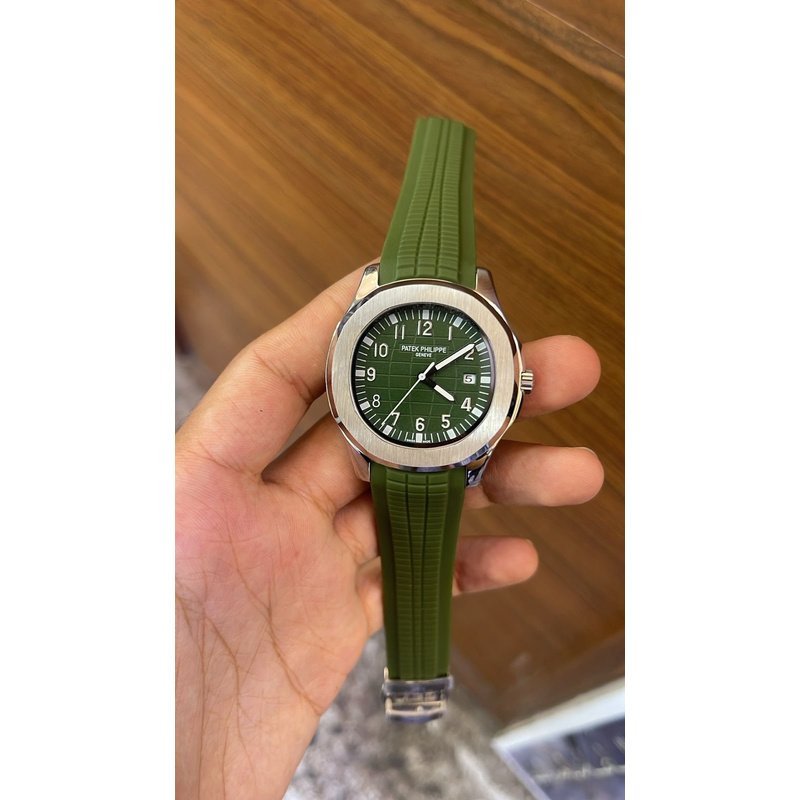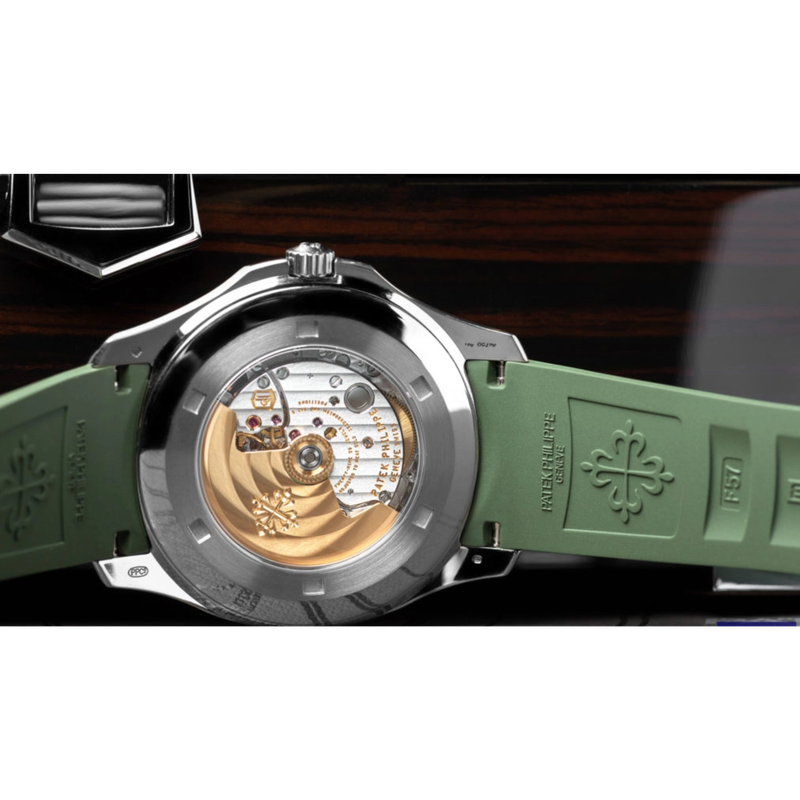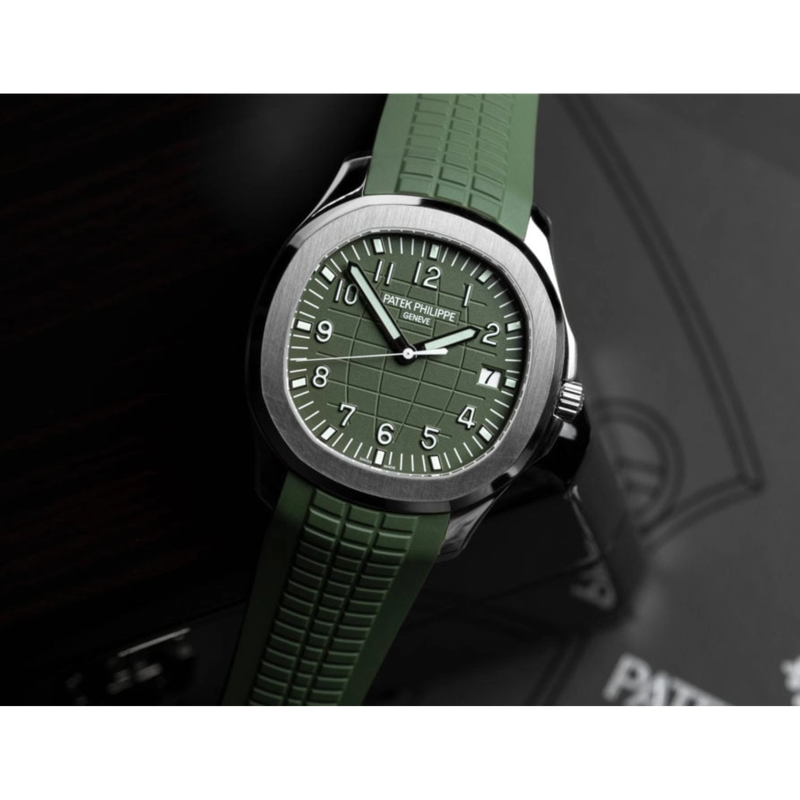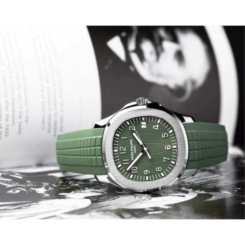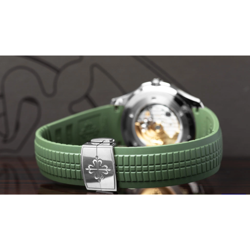 Bracelet en caoutchouc vert khaki texturé, souple et résistant. Fermoir déployant sécurisé en acier inoxydable.