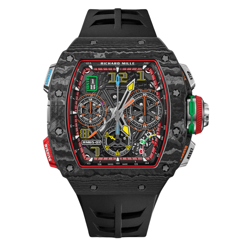 Un chronographe rattrapante révolutionnaire signé Richard Mille, avec un boîtier en carbone NTPT et un cadran squeletté multicolore. Un chef-d’œuvre technique alliant robustesse, innovation et design futuriste.