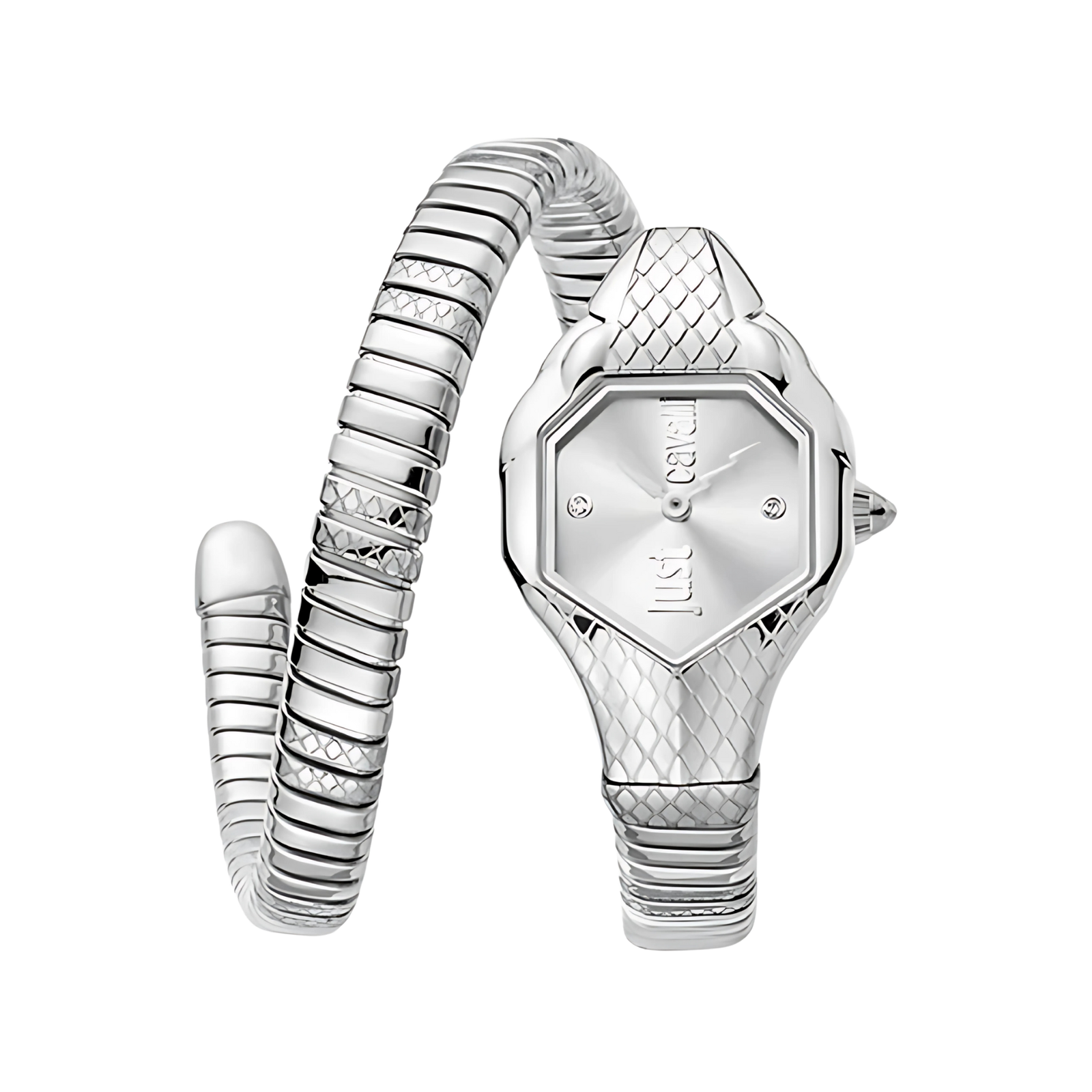 Boîtier argenté en acier inoxydable de forme asymétrique (22 x 33,5 mm), apportant une touche de modernité et d’audace au poignet.