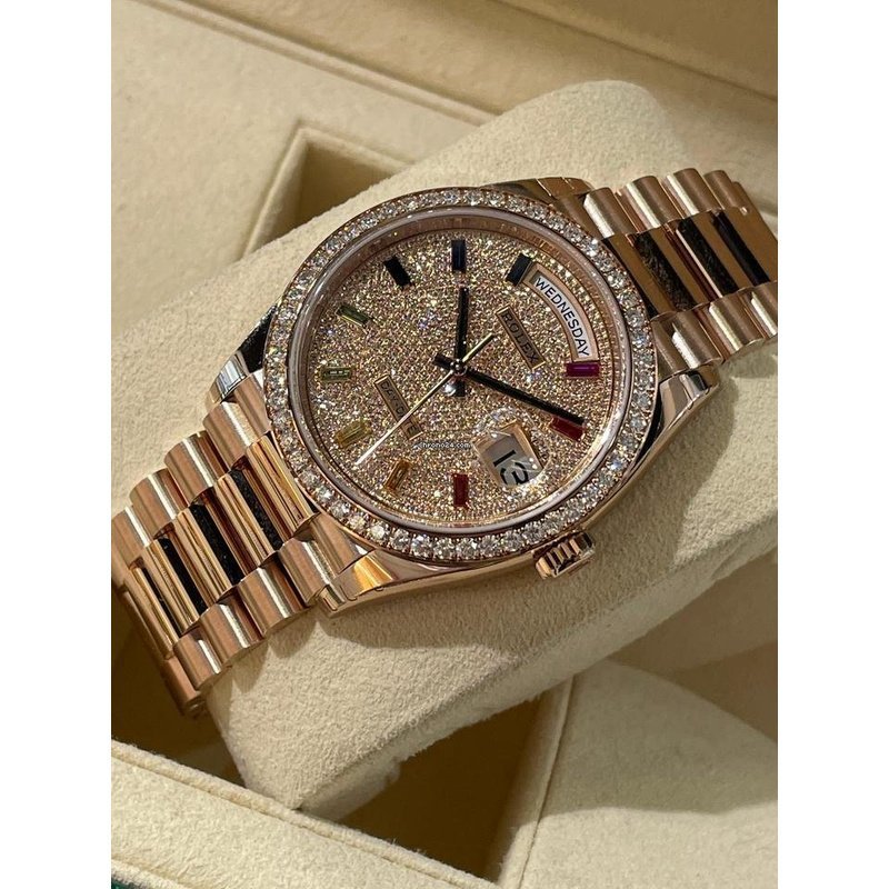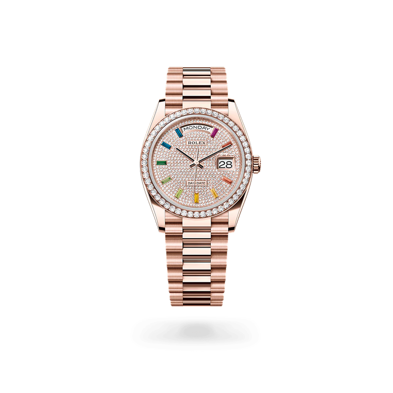 Cadran intégralement pavé de détails lumineux, orné d’index baguette multicolores qui ajoutent une note de modernité audacieuse. L’affichage du jour et de la date est parfaitement lisible.