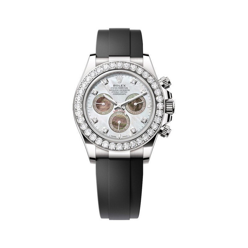 Un cadran en nacre blanche et noire, enrichi d’index scintillants qui apportent une touche raffinée et unique. Les trois compteurs du chronographe assurent une lisibilité optimale.