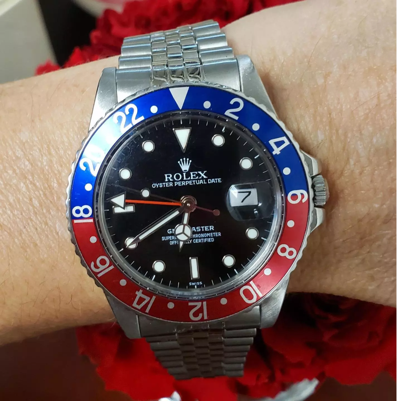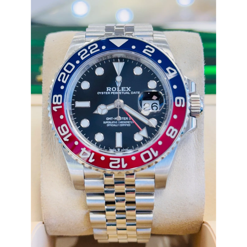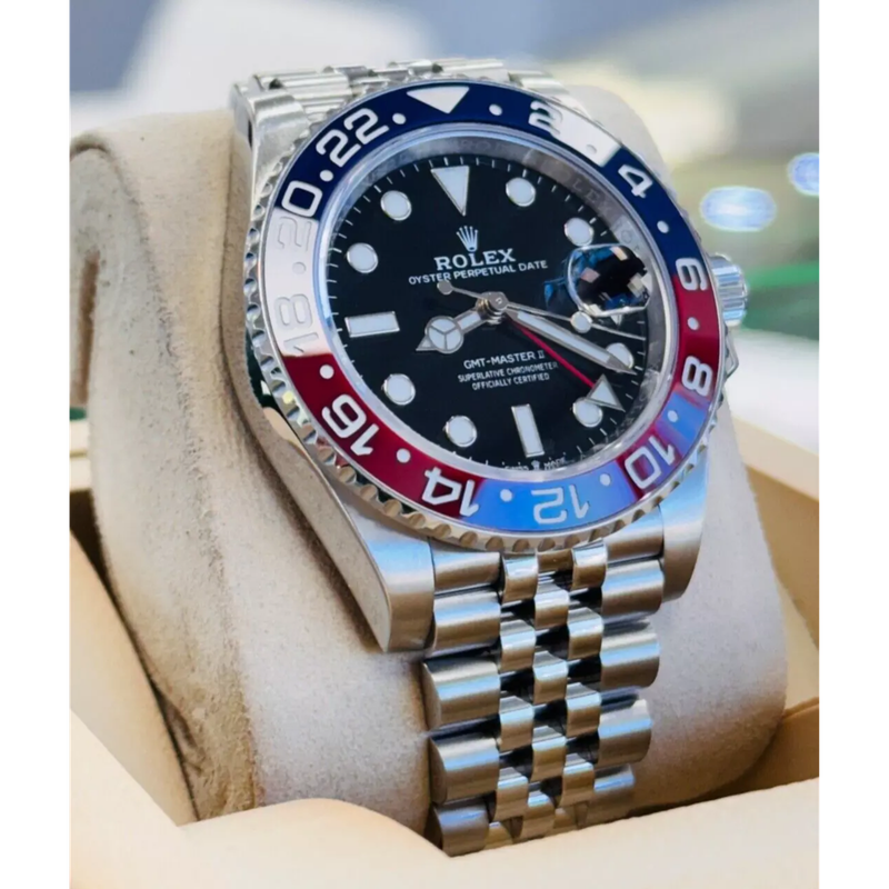 Le cadran de cette montre affiche un noir intense qui contraste parfaitement avec ses index clairs, assurant une lisibilité optimale. La trotteuse visible ajoute une touche dynamique et précise au dispositif. Cette pièce intègre une fonction de double fuseau horaire (GMT), idéale pour ceux qui souhaitent suivre simultanément deux heures différentes.