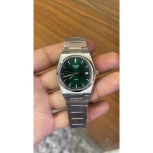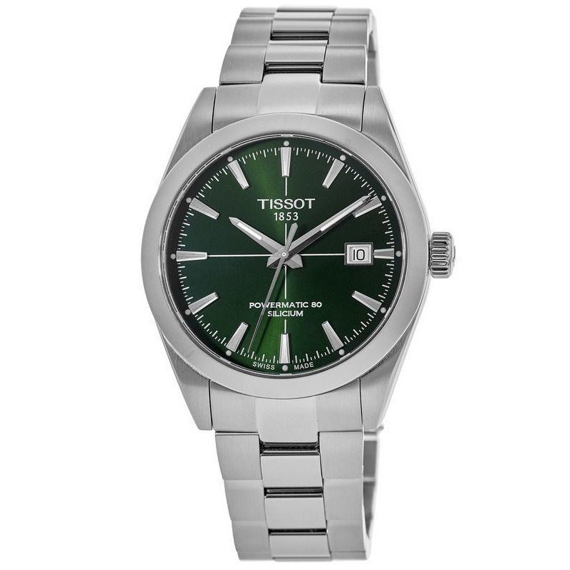Cadran vert soleillé, index bâtons luminescents, aiguilles rhodiées avec finition brillante. Date intégrée à 3h.