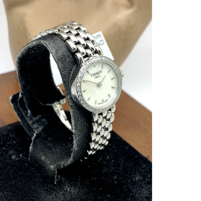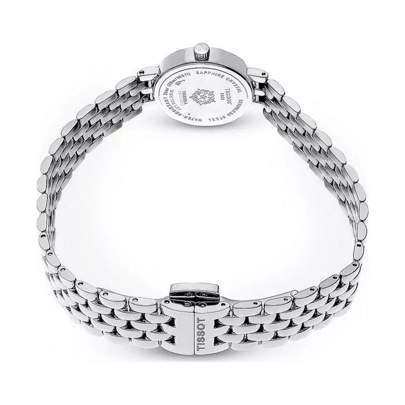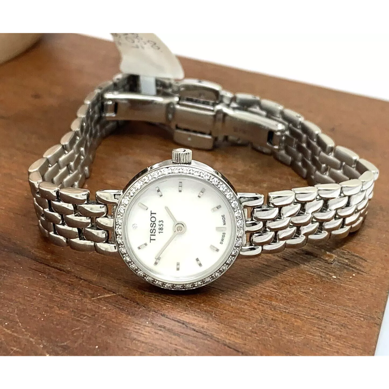 Le cadran lumineux de cette montre affiche une élégante nacre argentée. Il se caractérise par ses index minimalistes et ses aiguilles effilées, offrant une lecture claire et sophistiquée. La lunette fixe est ornée d’une décoration façon diamants, ajoutant un subtil éclat raffiné à l’ensemble.
