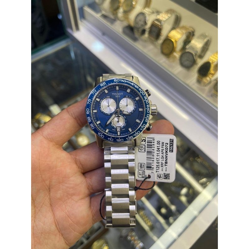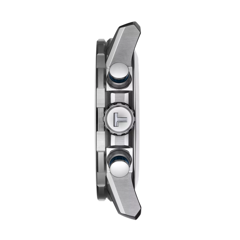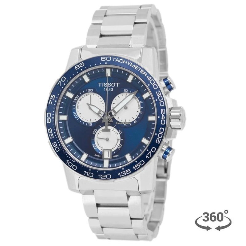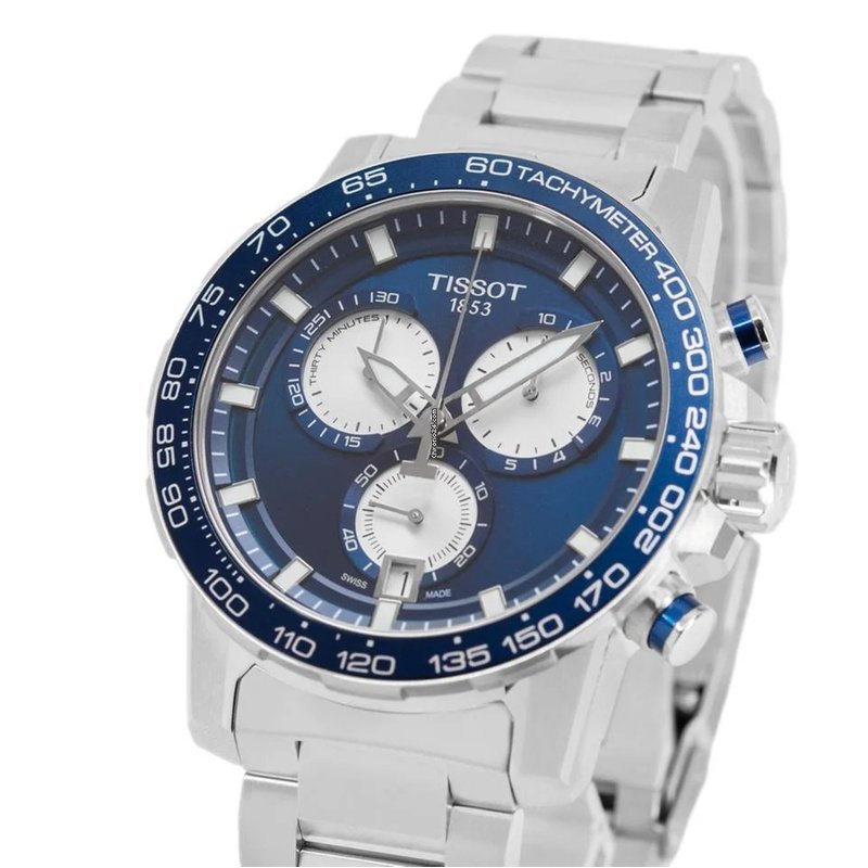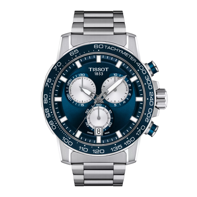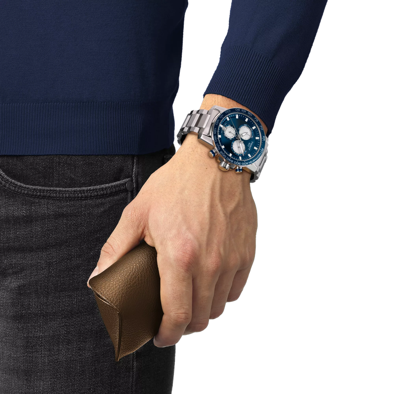 Cadran bleu intense avec index appliqués, aiguilles luminescentes Super-LumiNova® et trois compteurs de chronographe argentés.
