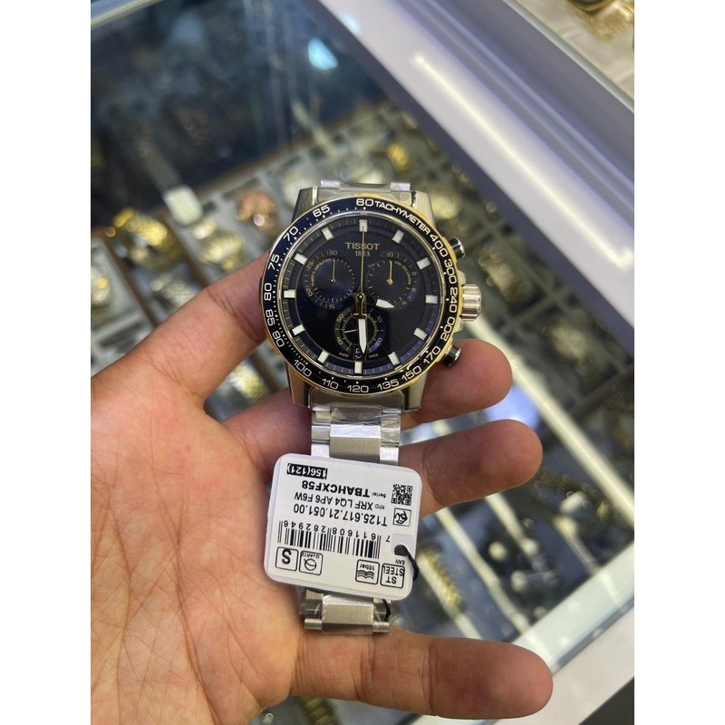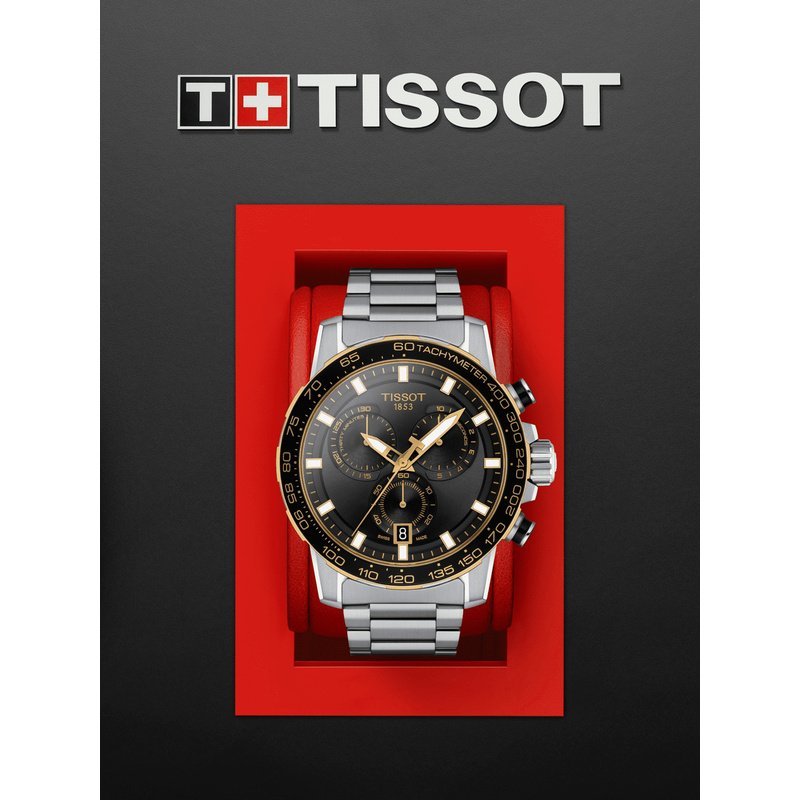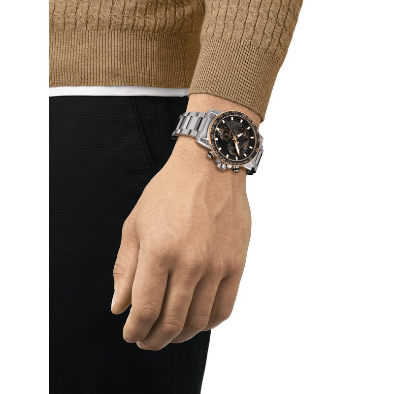 Boîtier en acier inoxydable 316L de 45.5 mm avec lunette tachymétrique noire en aluminium. Glace saphir résistante. Étanchéité jusqu’à 100 mètres.