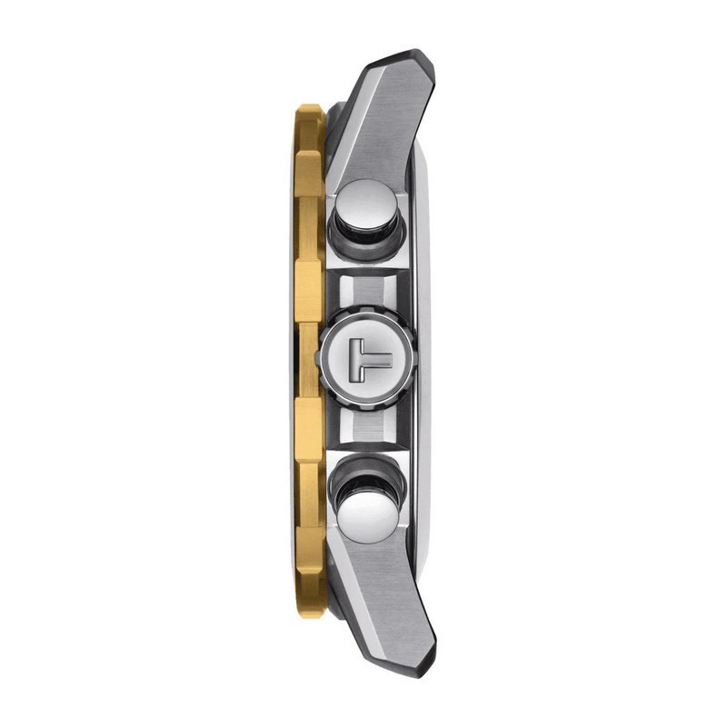 Cadran noir profond avec index dorés luminescents, trois compteurs de chronographe (60s, 30min, 1/10s) et guichet date à 6h. Aiguilles lumineuses.