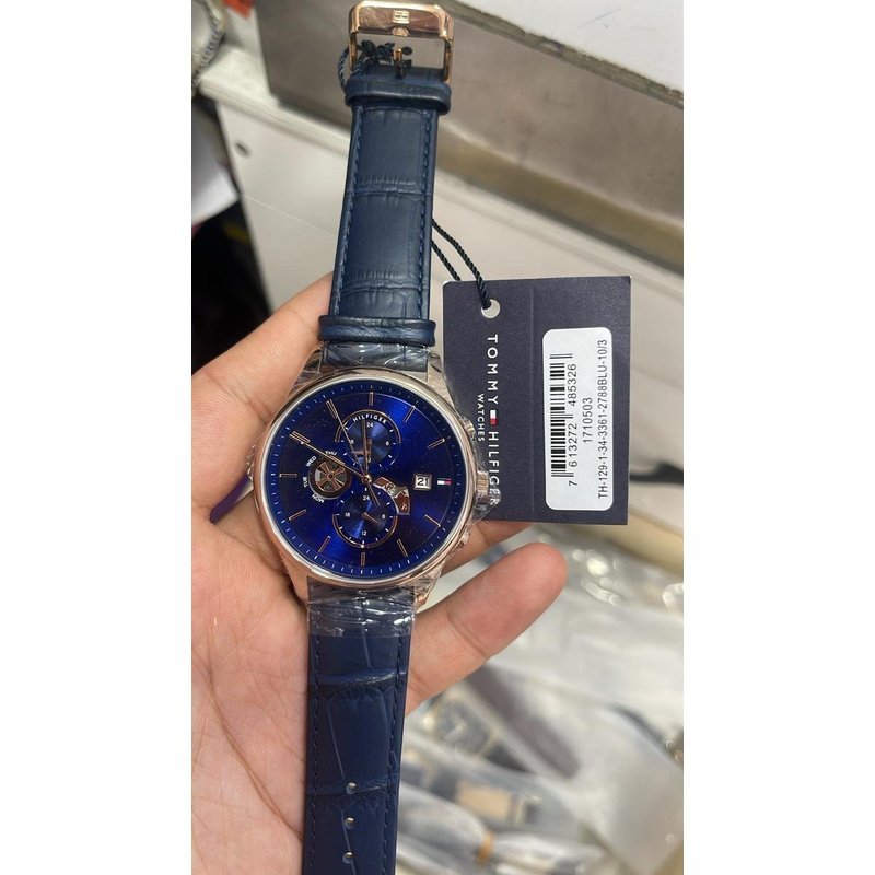 Ce modèle se distingue par un cadran bleu foncé raffiné, orné de compteurs chronographes bien intégrés. Les aiguilles dorées et les détails minimalistes offrent une excellente lisibilité et un style sophistiqué.