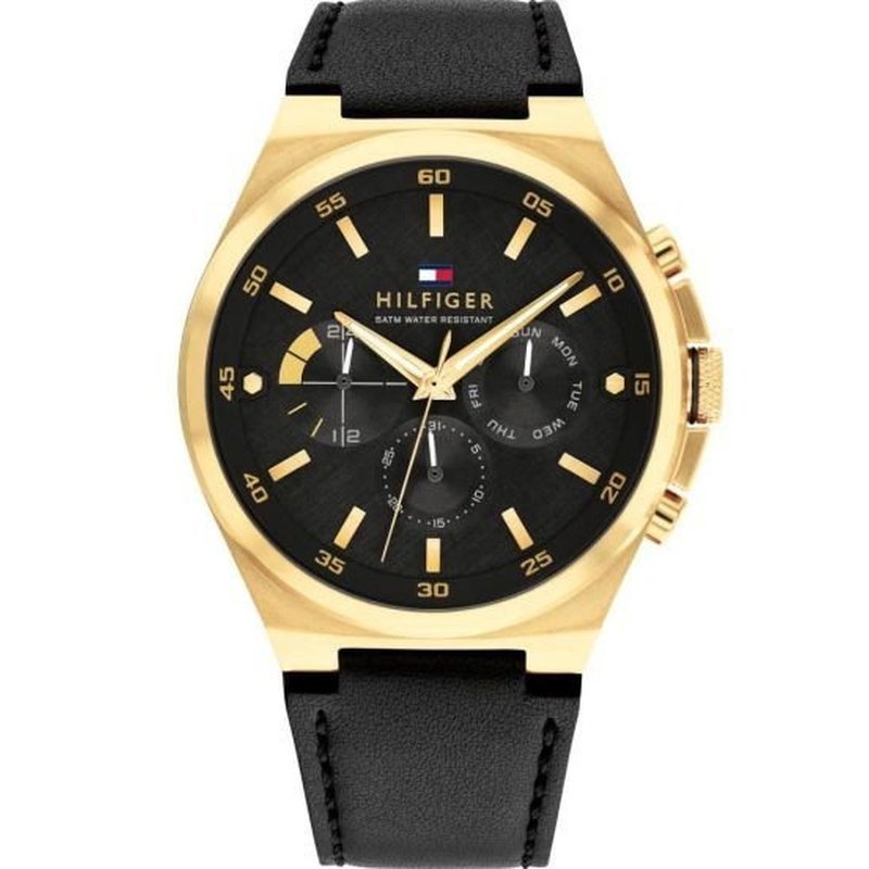 Le cadran noir texturé affiche un design équilibré, complété par des compteurs de jour, date et format 24h. Les index dorés et les aiguilles brillantes apportent une lisibilité parfaite.