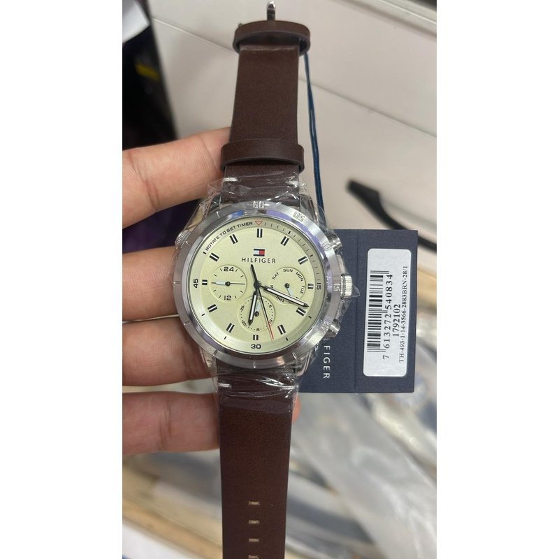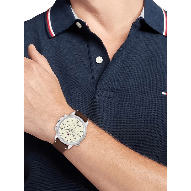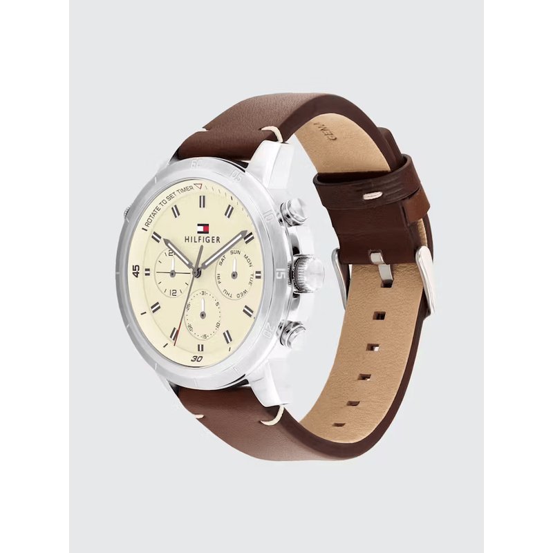 Le cadran couleur parchemin est sublimé par trois sous-cadrans multifonctions (jour, date, 24h), accompagnés d’index noirs raffinés pour une lisibilité claire et un style rétro-moderne.