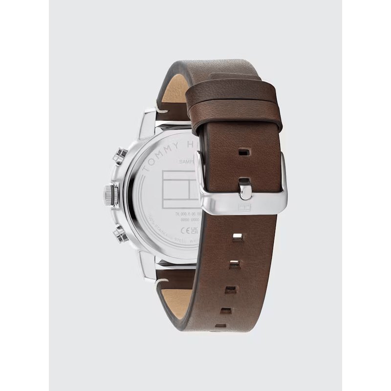Le bracelet en cuir véritable brun apporte une touche chaleureuse et naturelle, avec des surpiqûres crème visibles pour un look authentique et confortable.