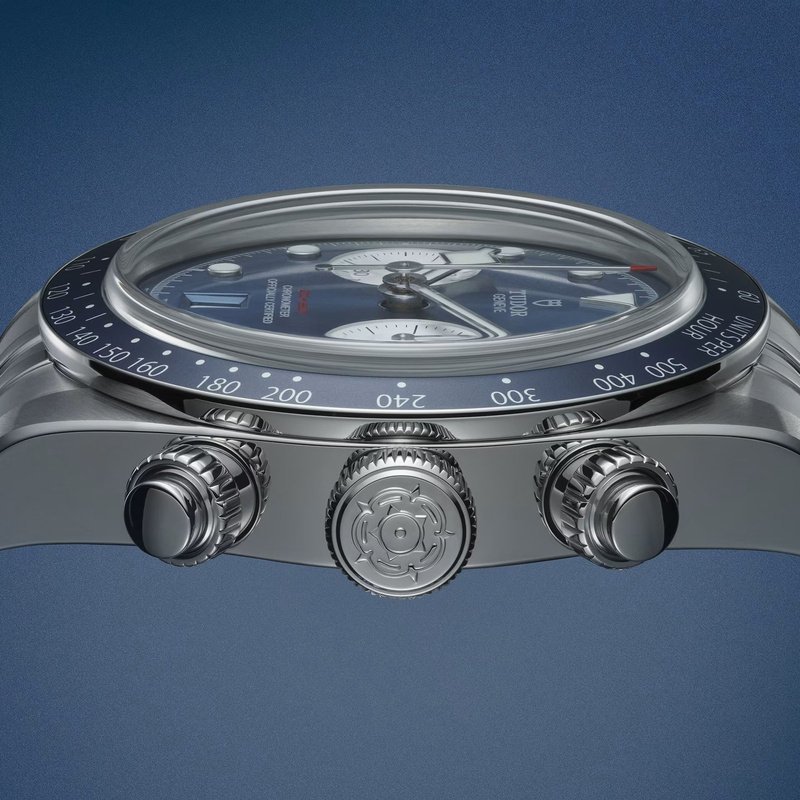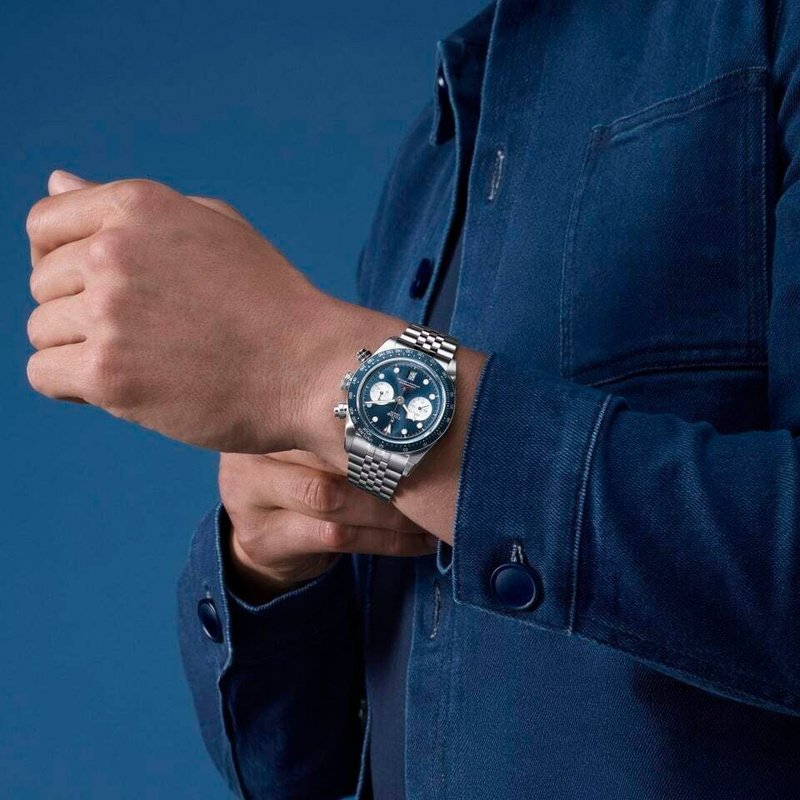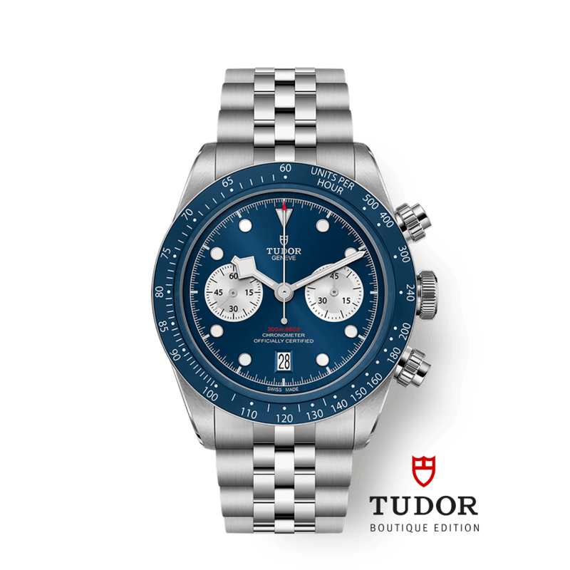 Une édition Boutique exclusive du célèbre chronographe Black Bay, combinant un cadran bleu profond et des sous-compteurs argentés pour un contraste saisissant.