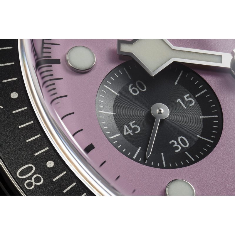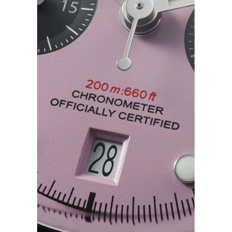 Cadran rose bombé avec compteurs noirs contrastés, échelle tachymétrique et guichet date à 6h.