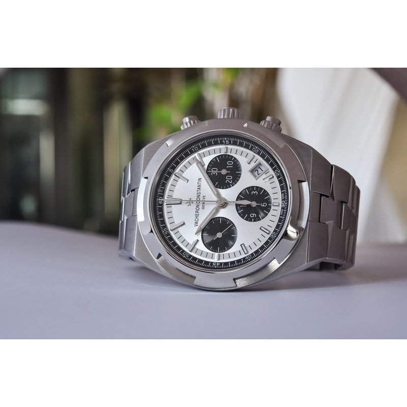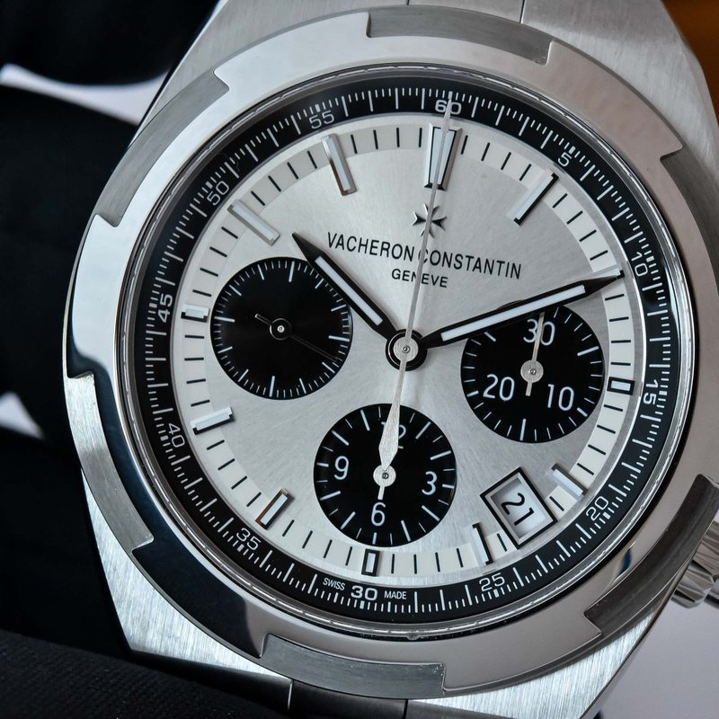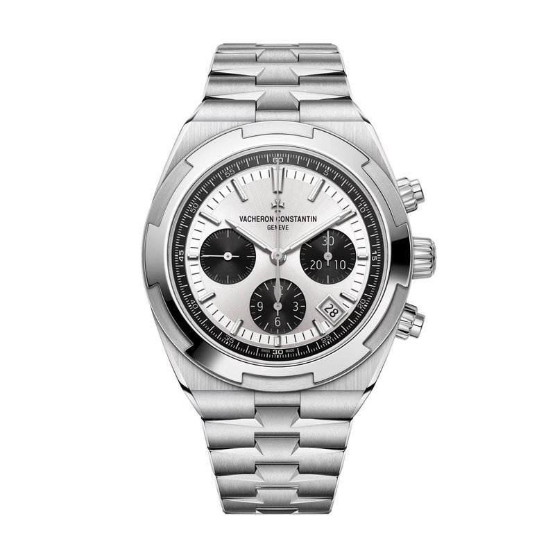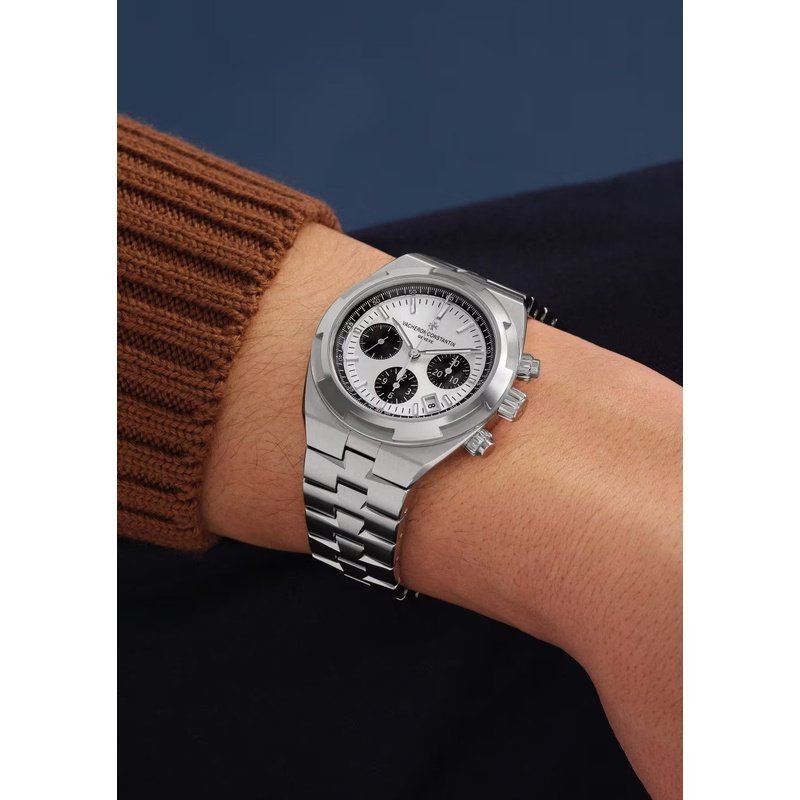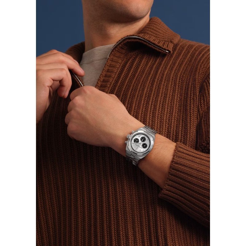 Cadran argenté laqué, finitions satinées et compteurs azurés, aiguilles et index luminescents, guichet date discret.