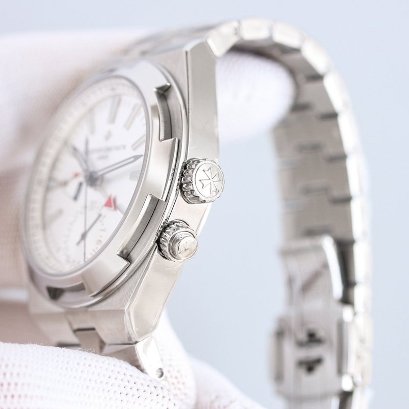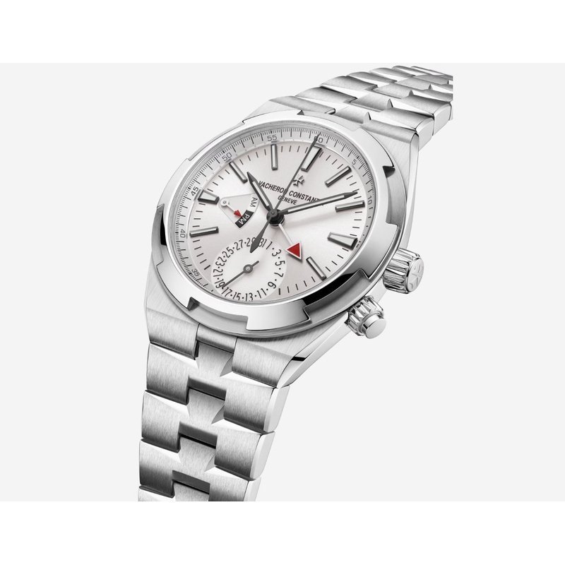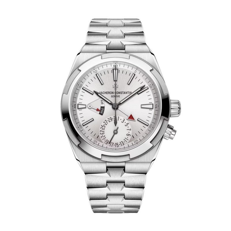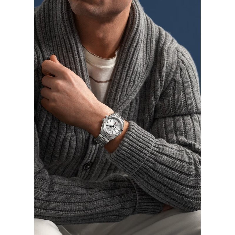 Cadran argenté laqué, finitions satinées soleil et veloutées, compteurs azurés, aiguilles et index en or 18K avec SuperLuminova®.